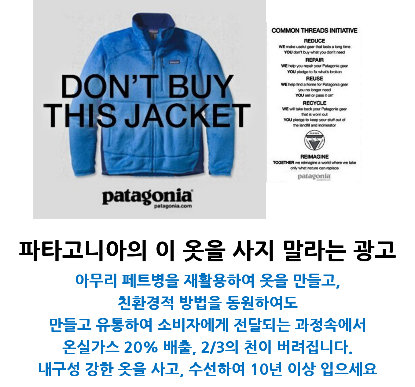 적잖은 기업은 환경 보호를 내세워 홍보를 하고 기부하기도 한다. 그러나 이런 기업들의 최종 목적은 이런 활동을 홍보수단으로 기업 자신의 이익을 극대화하는 것에 목적이 있다. 그런데 여기 전혀 다른 회사가 있다. 지구환경을 위해, 지속가능한 세상을 위해, 해양오염, 지나친 개발을 저지하기 위해 사업하는 회사가 있다. 아웃도어계에서 유명한 “파타고니아”이다. 파타고니아의 광고 중에는 환경과 지구의 개발을 반대하는 캠페인성 광고가 유독 많다. 대표적인게 우리 제품을 사지 말라는 광고가 있다. (Don’t buy this Jacket). 이 광고는 현재 가진 옷을 최대한 수선하고 오래도록 사용하여 제품의 라이프사이클을 늘려 새로운 제품을 사지 말라는 것이다.