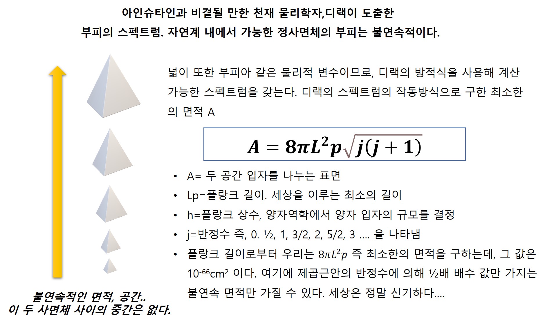 양자역학과 일반상대성이론을 통해 최소한의 공간의 한 축이 되는 최소한이 길이 플랑크 길이를 통해 최소한의 면적과 공간의 크기를 도출할 수 있습니다. 아인슈타인에 의한 공간이란 개념은 중력장으로 표현됩니다. 즉 부피는 중력장의 한 변수이며 우리가 있는 공간은 중력장이 얼마만큼 있는가를 표현합니다. 아인슈타인과 비견될 천재성을 가졌지만 상대적으로 덜 알려진 위대한 천재 물리학자 디랙에 의해 이런 부피의 스펙트럼을 나타내는 모든 변수의 계산법을 고안하였습니다. 이 결과 부피 역시 불연속적이라는 걸 알게 됩니다. 즉 부피는 ‘불연속적 다발’로만 이루어진것으로, 하이젠베르크 불확정성 원리, 전자기장의 에너지가 불연속적 다발 광자로 형성된 것과 매우 흡사합니다.