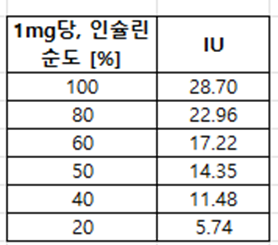 1mg의 인슐린인 28.69 IU가 된다는 말도 같다. (28.7 IU/mg)