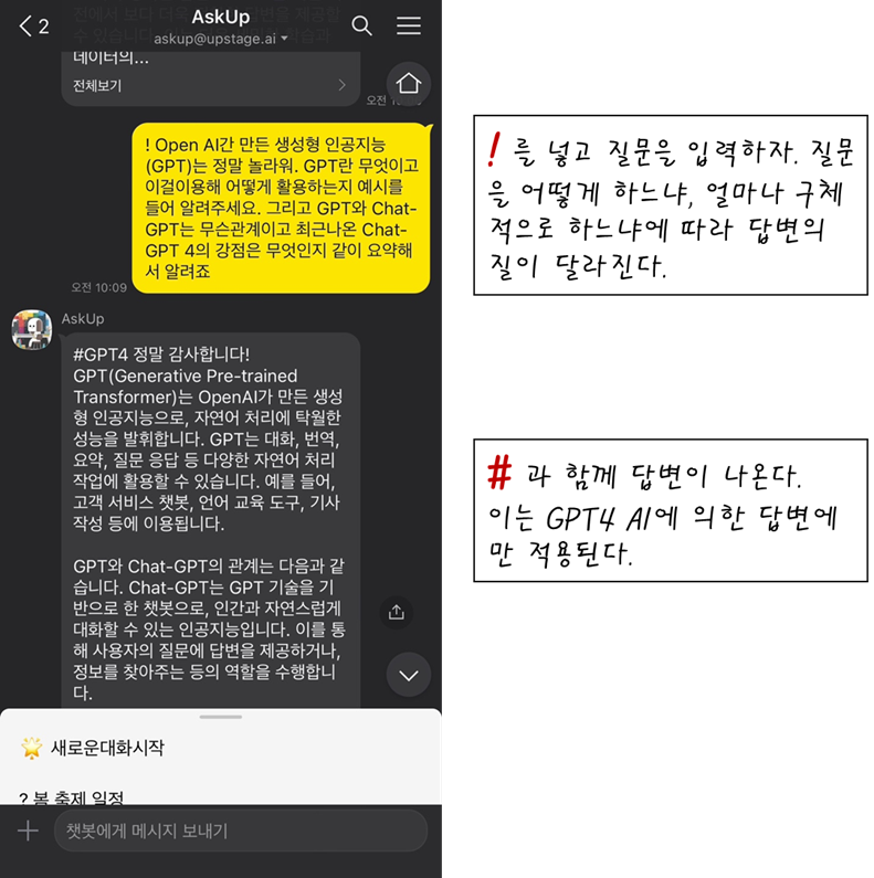 만약 명령어에 !를 붙이지 않고 질문하면 일반 GPT3.5버전이 적용된다. 반드시 !를 넣어야 답변에 #이 표시되면서 GPT4가 생성한 답변을 받아볼수 있다.