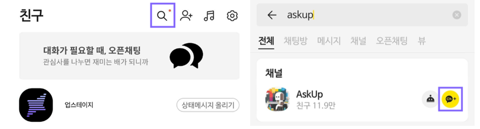 Askup을 카카오톡 친구로 추가: 카카오톡 검색창에 Askup 을입력하여 채널 카테고리 아래 그림처럼 Ch+버톤을 클릭하여 카카오톡 플러스 친구로 추가하면 끝.