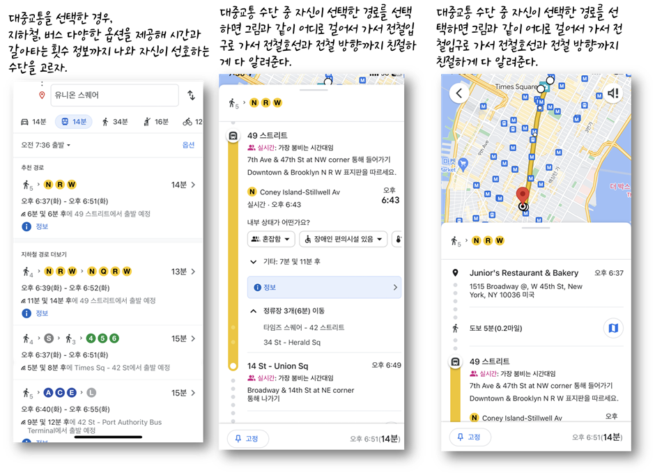 어느 지역에서 출발하든 목적지를 JFK 공항으로 입력하면 자신의 현재 위치에 맞는 대중교통 수단과 가는 방법, 이동 시간 모두 제공된다. 심지어 자신이 버스 또는 전철을 타고 이동중에도 현재 위치가 실시간 표기되기에 자신이 내려야 하는 정류장에서 영어로 안내되는 걸 잘 알아듣지 못해 내리는 위치를 놓치는 실수도 피할 수 있다. 뉴욕 지하철 같은 경우 지하이기 때문에 GPS위성통신이 닫지 않아 자신의 실시간 위치 파악이 되는지 반문하는 경우가 있는데, 실시간 이동현황이 된다. 단 전철역과 전철역 이동 중간에는 멈추고 역에 들어서면서 자신의 현재 위치가 바로 나타나므로 걱정하지 않아도 된다.