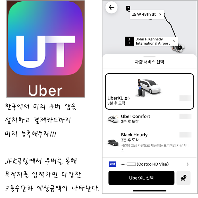 공항에 내려 입국심사후 진짜 뉴욕 땅에 밟았을 때 우버 앱을 가동시키면 실시간 자신의 위치가 표기되며 바로 우버 차량을 호출할 수 있다. 차량은 소형의 Economic부터 프리미엄, SUV급 및 대형 다인승 차량 등 자신의 상황에 맞는 차량급을 고르면 된다. 공항은 항시 택시를 비롯해 다양한 교통수단이 필요로 하는 곳이기에 우버 호출은 바로바로 연결된다.