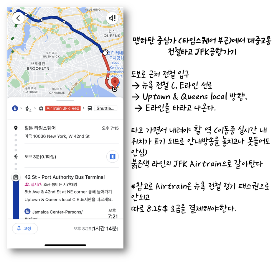 맨하탄 타임스퀘어 부근을 기준으로 뉴욕 현지 전철 E라인과 공항 JFK AirTrain 전철로 갈아타게 되어 약 1시간 15분 소요된다.