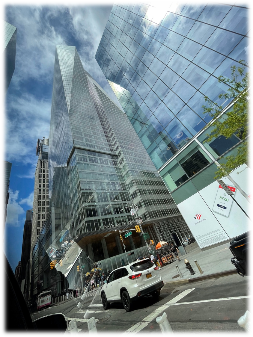 필자는 JFK공항에 점심때쯤 도착했고, 입국 심사하고 짐 찾고 하니 1시간이상 훌쩍 흘렀다. 이미 점심에서 오후로 기우는 시간대에 JFK공항과 맨하탄 도심간 도로는 매우 정체된다. 항상 그렇게 흘러 이동시간만 정체로 인해 1시간 이상 소요된다. 이번에 우리가 호출한 우버 기사는 도심으로 가는 하이웨이가 hot하다며 매우 막히니 여러 우회길과 골목길을 이용해 돌파해 나갔다. 덕분에 시간을 좀 줄였으며,, 필자는 맨하튼 거의 도착시 15% 팁을 눌렀다. 처음 JFK공항에선 진출하고 한동안 교통정체가 매우 심하다. 맨하튼 섬으로 들어가기 위한 터널에 다가오면서 정체는 서서히 풀리며 맨하튼의 전경이 눈에 들어왔다. 한국의 미세먼지 대기만 보아오다가 세계 최대 도시 뉴욕의 맑은 대기와 새하얀 뭉게구름, 탁 트인 전경을 보니 한국의 미세먼지가 매우 심하다는 걸 다시한번 느끼게 되는 전경이 펼쳐졌다.