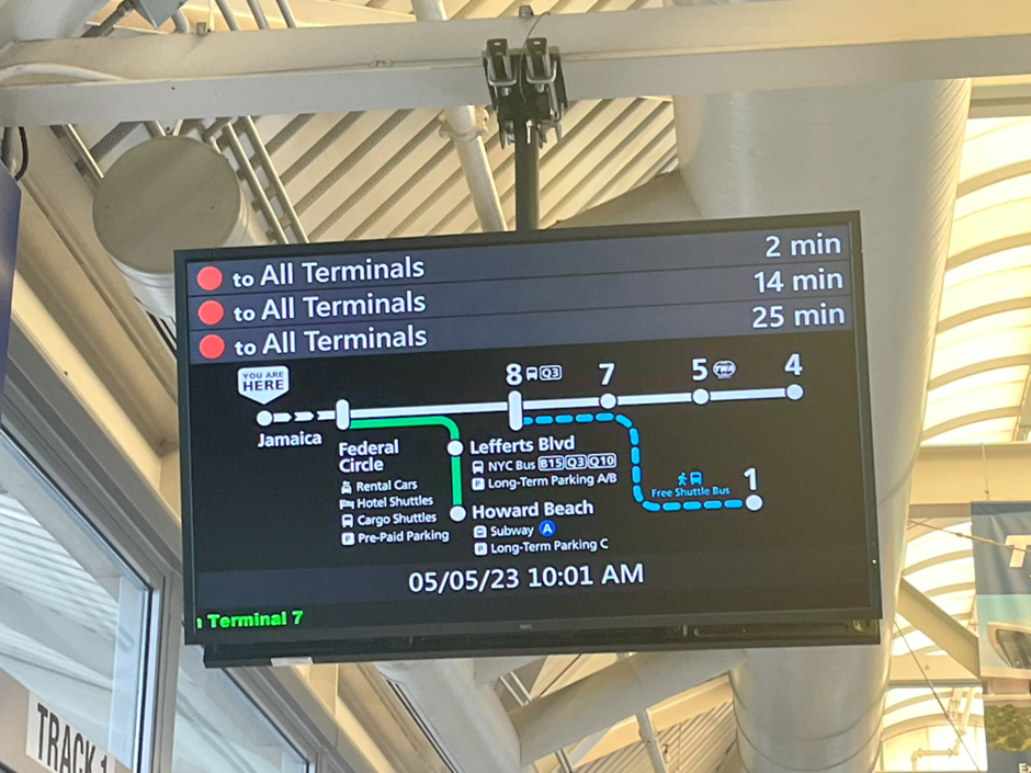 보통 대한민국행으로 운항하는 항공은 대한항공과 아시아나를 비롯하여 1터미널에 위치해 있다. 현재 2023년 5월 기준 JFK는 주변 정비 및 확장공사를 진행중이어서 일시적으로 AirTrain은 1터미널은 들어가지 못한다. 사진의 안내와 같이 1터미널로 가기 위해서 제일 첫번째 역인 JKF 8터미널에 내려 공항 셔틀을 이용하여 1터미널로 가면 된다 (사진의 파란색 점선). 공항 셔틀이기에 따로 요금지불 없다.