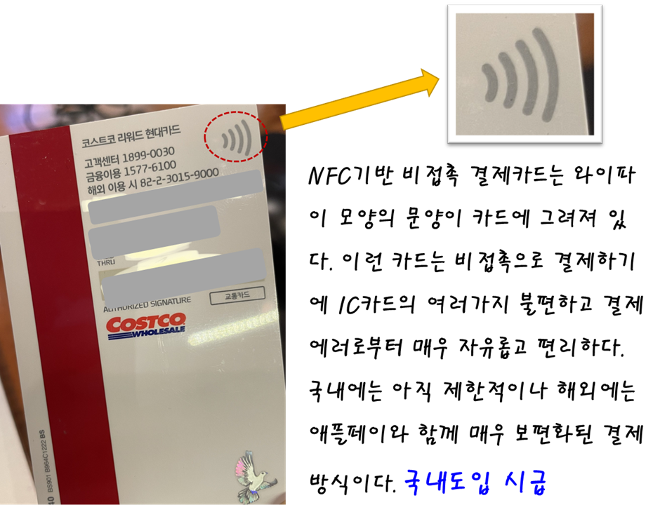 한국은 결제카드가 현재 IC칩으로 법적으로 고정되었다. 따라서 와이파이 모양이 새겨진 NFC기반의 비접촉 결제 가능 신용카드는 사용처가 매우 드물다. 아이폰의 애플페이가 도입되면서 이제 확대될 가능성은 커졌으나 여전히 자영업장과 대다수의 키오스기계는 IC카드와 마그네틱 기반의 신용카드만 가능하다. IC의 단점은 꼽아야 결제가 가능하고 이게 시간이 지날수록 물리적으로 손상이 되면서 언젠가 결제가 한번에 여러 번 반복해야하는 불편이 따른다. 진작부터 와이파이 모양이 새겨진 NFC결제 신용카드가 되면 단순히 비접촉으로 가까이 접근만 하면 (탭 하기만 하면) 결제가 되고 결제 에러가 없어 반복적으로 꼽거나 긁어야 하는 불편이 없다. 왜 NFC가 아닌 IC칩으로 했는지 의문이다. 해외 대부분 선진국가는 NFC기반의 비접촉 카드 결제가 보편화 되었다. 때문에 애플페이도 널리 보급되었다.
