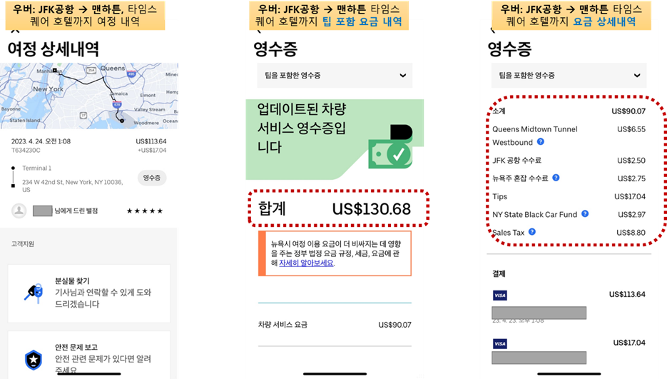 영수증 내역을 보시면 알겠지만 총 금액은 130달러 정도 나왔으며 이중 순수 운전자에게 돌아가는 금액은 팁을 제외하고 90달러 정도 된다. 여기에 각종 뉴욕시와 공항에서 징수하는 각종 수수료가 들어간다. 여기에 더해 팁을 줘야 하는데 우버 앱에서 이동중에 실시간으로 자신이 팁을 정할 수 있다. 앱 상에서 팁을 10%, 15%, 20% 중 선택하거나 아니면 자신이 직접 금액을 정해서 입력할 수도 있다. 팁을 누르고 나면 탑승을 마친 후 이동요금과 함께 팁이 따로 결제되어 총 카드에서 2번 결제되는 모양이다.