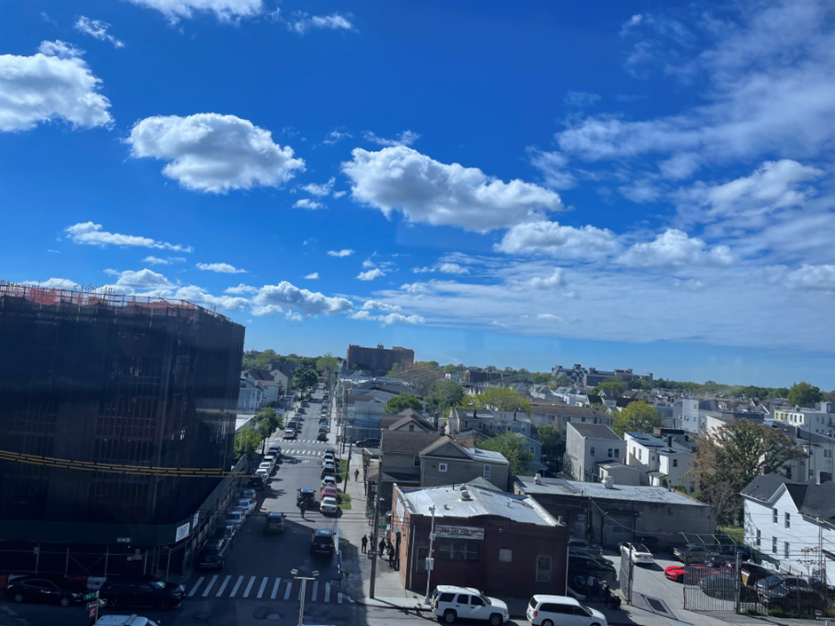Airtain을 타는 Jamaica 동네 풍경이 파란 하늘, 미세먼지 없는 깨끗한 대기, 뭉게구름 등이 어울려 시원한 풍경을 보여준다.