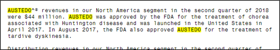 2017년 4월 FDA는 Austedo라는 신약하나를 허가하였다. 이 약물은 기존 Xenazine의 약물과 구조적으로 완벽히 똑같은 약물이어서 일명 카피약(제네릭 의약품)과 같은 종류일 것으로 보였다. 그러나 카피약 수준의 독점권이 아닌 5년 독점권을 가졌으며, 구조가 완전히 새로운 화학구조로 승인받는 신약과 동등한 신약 (NCE 신약, 505b2트랙으로 허가, 굳이 여기서 이런 용어는 알 필요 없다) 허가되었다. 아래 그림을 보자