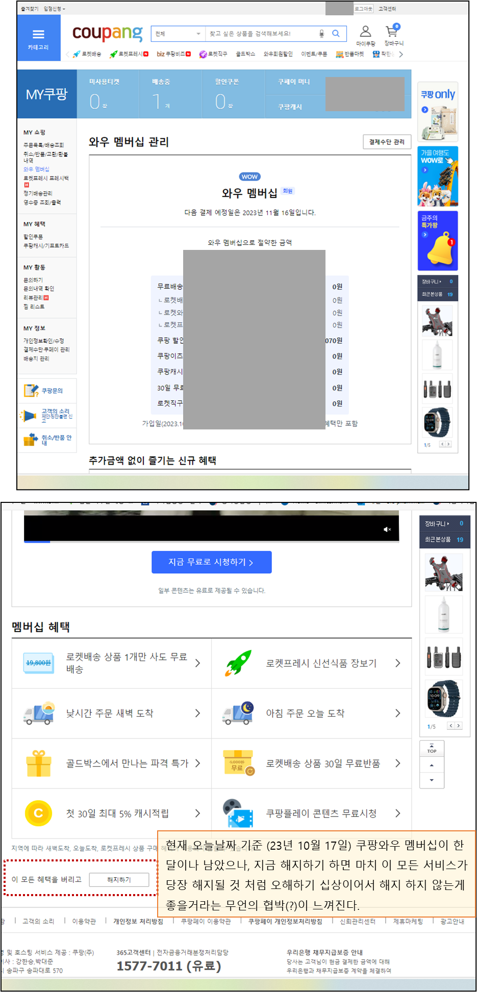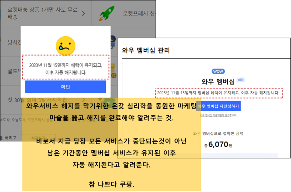 이렇게 소비자인 우리를 온갖 심리학적 마케팅 기법을 동원하여 우리를 기만하는 와우서비스 해지막기 마케팅을 뚫고 해지하고 난 이후에 비로소 지금 해지해도 남은 서비스 기간 동안 와우멤버십 서비스가 유지된다고 알려준다.