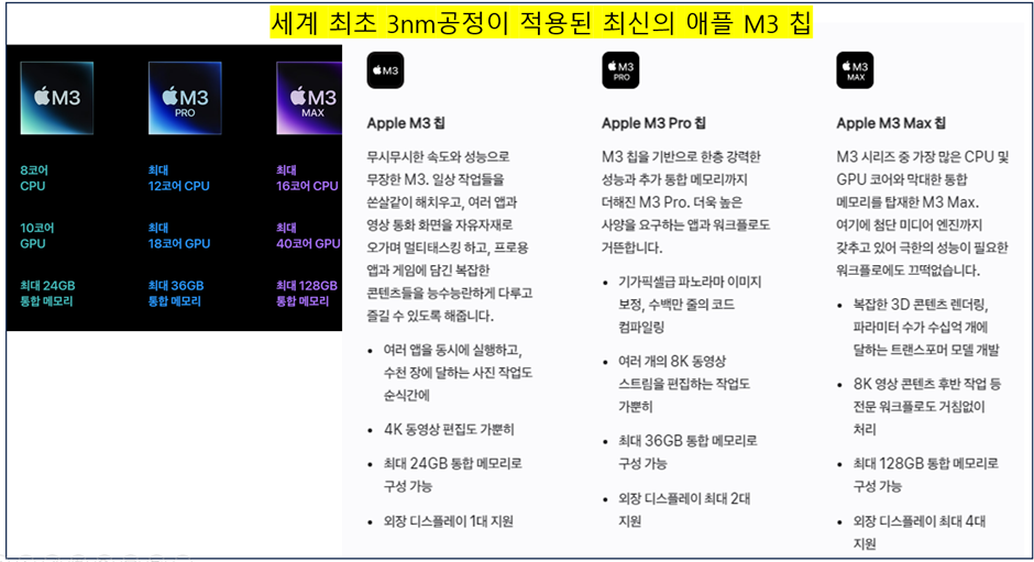 드디어 기다리던 맥북 M3가 출시되었다. 애플 실리콘 M3는 인류 역사 이래 최초 3nm 공정이 적용된 칩을 기반으로 생산된 System on Chip으로 현존 개인용 컴퓨터 사상 처음으로 적용된 제품이다. 기존 5nm로 생산된 M1, 2세대 5nm 공정이 적용된 M2에 이어 완전히 새로운 애플실리콘이 공개된 것이다. 단순 산술적으로 5나노에서 3 나노로 생산된 칩은 동일 칩 면적에서 40%나 많은 트랜지스터 직접도를 올리는 만큼 그만큼 성능 향상 또는 전력을 아낄 수 있다. M3 라인업으로 이번엔 전과 다르게 M3, M3프로, M3 맥스 3종이 한꺼번에 공개되었고 (아직 M3맥스를 2개 묶은 울트라는 미공개) 이를 적용한 맥 제품은 데스크톱 형태인 아이맥과 노트북인 맥북으로 공개되었다. 이들 제품을 사려고 애플 공홈에 가면 칩에 따라 통합메모리, SSD 용량, 칩의 core 수에 따라 여러 가지 조합으로 머리가 아파진다. 이를 일목요연하게 한눈에 파악할 수 있게 정리해 보자.정리해 놓고 보니 가격을 보았을 때 기존 M2 역시 여러 제품군과 함께 옵션별로 정리하여 과연 내 예산과 내가 생각하는 성능의 균형을 어떻게 맞출지 일목요연하게 파악하기 위해 정리해 보았다.