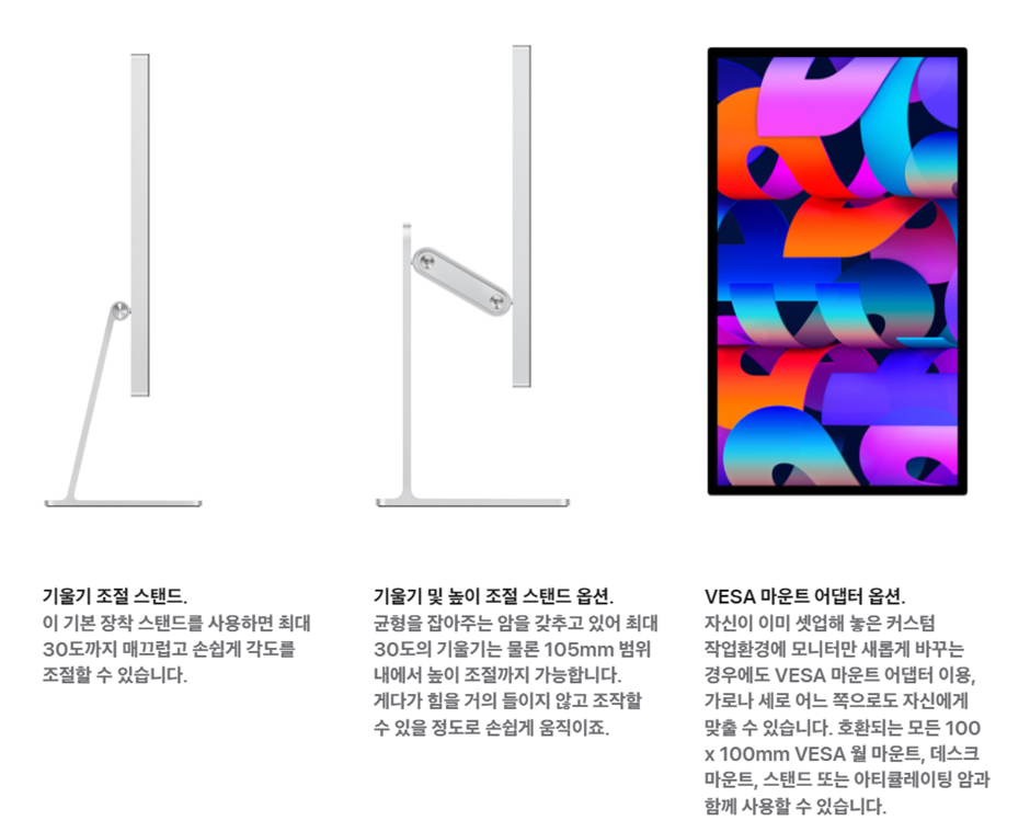 이것의 기본가격이 209만 원이고 저반사 나노텍스쳐 제품이 249만 원이다.기울기 조절 스탠드다 베사 마운트를 기본으로 선택가능하며 (참고로 베사마운트를 선택하면 모니터 뒤 애플 로고가 좀 가려진다. 모니터를 벽 앞에 설치하면 문제없겠으나 벽이 아닌 곳에 모니터 등이 보이는 곳에 설치하면 애플로고 감성을 위해 기울기조절 스탠드 선택해야 함).스탠드 기울기에 높이조절 스탠드는 옵션으로 이걸 선택하며 거의 60만 원의 추가 비용이 든다. 그래서 결국 모니터 가격이 대략 206만 원 정도인데.. 모니터 치고 꽤 비싼 가격이지만 5K를 생각하고 애플 전용 제품, 그리고 전문작업 (색감이 중요한)을 생각하면 오히려 가성비 모니터이다.