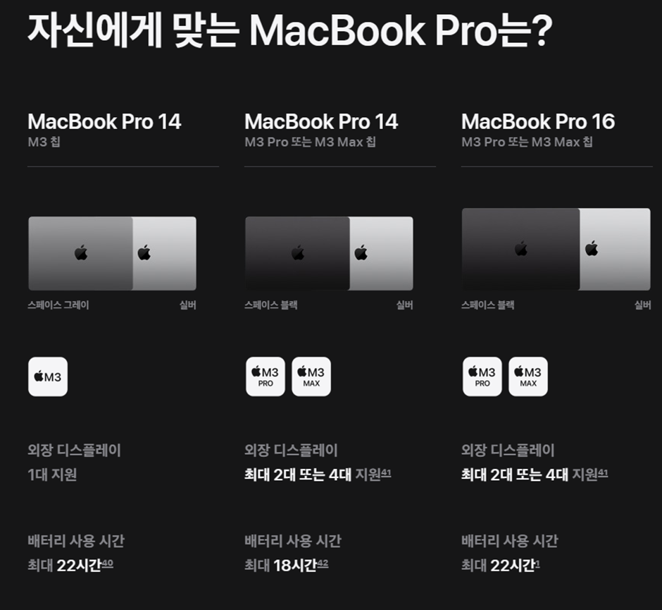M3, M3 Pro, M3 Max 3가지로 구성되었으나 그 세부사항 옵션을 선택하는 과정에서 많은 갈림길이 있으며 이에 따른 가격표이다. 표는 기본적으로 14인치를 기준이며 애플다운 최상위급 품질좋은 디스플레이를 탑재한 프로급 노트북이다. 극강의 HDR 밝기를 구현해 주는 익스트림 다이내믹 레인지(XDR)가 반사광 하이라이트는 세밀하게, 암부의 디테일, 색감은 선명하고 사실적으로 표현하며 공장에서 하나하나 보정 절차를 거쳐 완성되며, ProMotion 및 전문가용 레퍼런스 모드 또한 갖추고 있다. 기본적으로 Neural Engine 16코어가 전부 적용되어 표의 사양에는 생략하였다. 표 아래 녹색은 16인치 선택 시 동일 사양에서 추가되는 금액을 표기하였다. 16인치 선택시 14인치에 비해서 기본적으로 37만 원에서 최대 47.5만 원 가지 동일사양에서 가격이 올라간다. (왜 그럴까?) M3, M3 pro, M3 Max는 기본적으로 칩의 크기가 달라 집적되는 트랜지스터의 차이로 인해서 CPU와 GPU코어수가 달라지며 당연히 늘어갈수록 가격이 비싸진다. 여기에 통합메모리와 SSD용량을 선택해 주면 되는 구조이다. 만약 자신이 컴퓨터에 여러 응용프로그램을 백그라운드에 다양하게 돌리면 통합메모리를 높게 가져갈수록 좋다. 또한 영상편집등 매우 높은 용량의 파일을 다룬다면 SSD 용량이 높은게 외장 SSD를 거추장스럽게 달지 않고 작업할 수 있고 속도도 빠르다. 하지만 USB3.0이상 혹은 썬더볼트 연결 외장 SSD를 달고 작업한다고 하면 기본 SSD를 작게 가져갈 수도 있다.