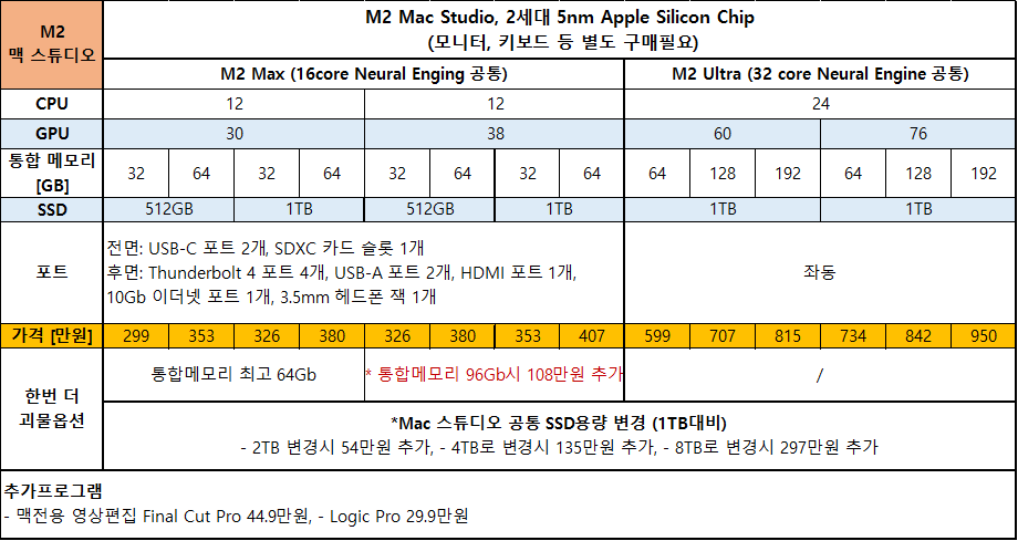 4. 맥 스튜디오의 사양별, 옵션별 통합 가격정리