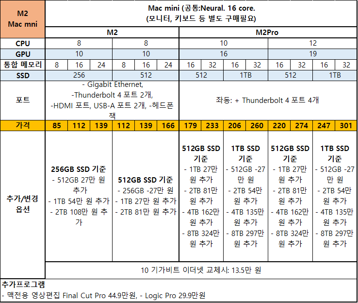 5. 맥스튜디오가 부담스럽다면 M2 맥 미니(Mac mini) 사양별, 옵션별 가격정리