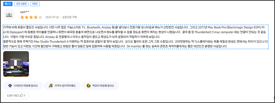 나는 삼성 뷰티니티S9 제품으로 가격에 홀려 넘어갔다가 최종 애플 스튜디오 디스플레이로 결정하였다. 그 이유로는 삼성뷰티니티 S9 삼성 공홈 상품평을 보다가 대부분 좋은 평인데 간혹 하나씩 호환성과 발열, 불량화소, 맥과 연결 오류등이 보여 마음이 흔들리기도 했다. 물론 종합 만족도 평점은 5점 만점에 4점이 넘어 가나 간혹 별 한두 개의 불량 혹은 호환성 문제가 올라왔다. 물론 뽑기 운이라 생각이 드나… 이런점과 맥과 완벽한 호환성과 디스플레이 본연의 기능과 성능, 그리고 맥제품과 조화를 생각해서 최종 스튜디오 디스플레이로 정하였다.