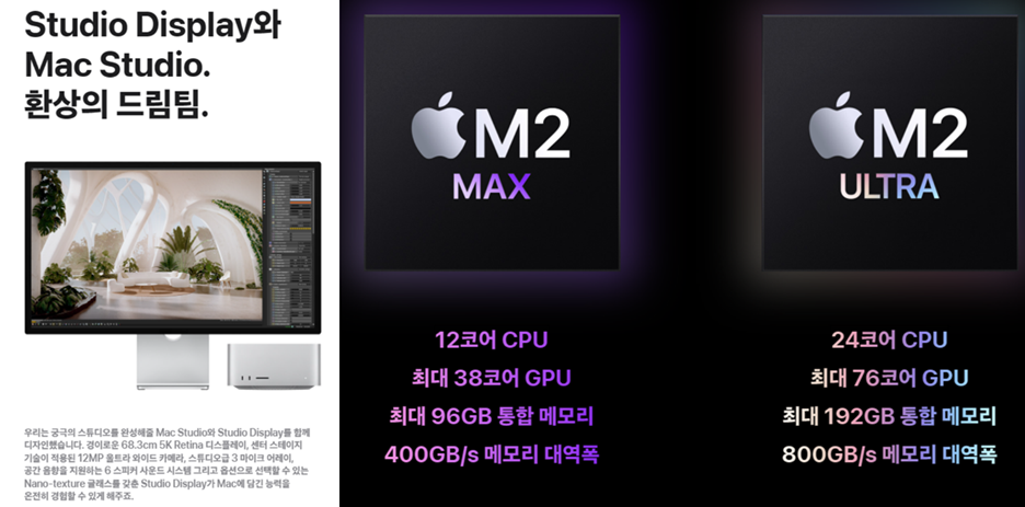 기본적으로 맥 스튜디오는 고사양으로 특화된 컴퓨터로써 고사양 영상, 음악, 그래픽의 높은 수준의 데이터 처리에 알맞은 데스크탑 컴퓨터이다. (아직 M3 맥 스튜디오는 나오지 않았다.) 그러기에 M2맥스부터 울트라까지 라인업이 되어있다. 고사양 작업답게 성능과 확장포트가 넉넉히 준비되어 있다. 물론 모니터, 키보드는 없이 오직 본체만이므로 이부분은 기존 가지고 있는 거나 혹은 새로 옵션을 통해 구매해야 한다.모니터는 애플제품의 5K 200만 원대만원대 (스튜디오 디스플레이) 제품은 아래를 참고하자.