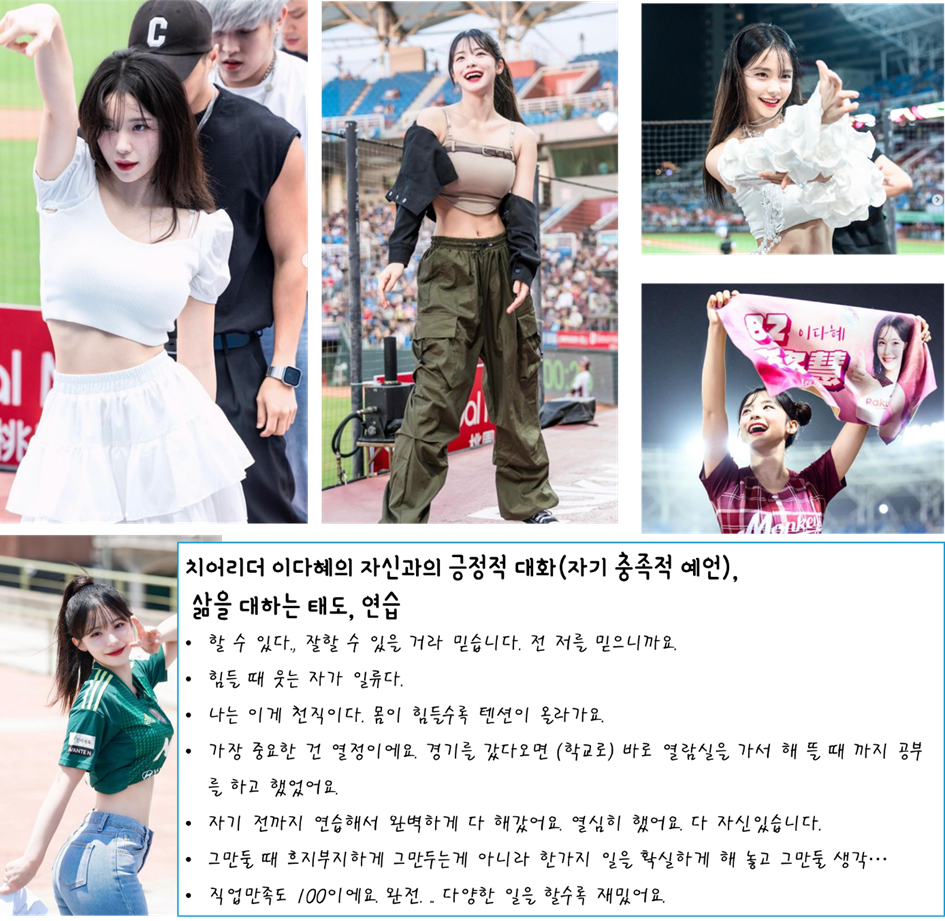 주변 비교적 가까운 사례로는 최근 (2023년) 국내최초 해외진출(대만) 치어리더 이다혜가 있다. 젊고 밝은 성격소유자의 이다혜 치어리더는 자신의 직업을 천직으로 여기며 가장 열정적으로 열심히 활동하는 치어리더 중 하나로 별명이 국내 치어리더 원탑 (One Top)이란 의미의 ‘국치원탑’이란 별명까지 얻었다. 하지만 이런 열정이 오히려 여러 오해를 일으키고 힘든 시기를 거쳐 결국 자의 반 타의 반으로 일을 그만두게 되었다.