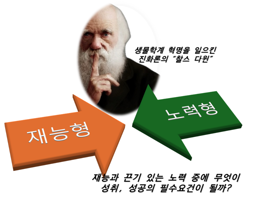 위대한 생물학자이자 생물학의 패러다임을 바꿔 혁명을 일으킨 다윈 (종의 기원)은 우리가 생각하는 소위 말하는 지적 재능 (똑똑하다는 표현)은 뛰어나지 않았다. 오죽하면 수학적 재능이 없어서 자연과학의 필수인 수학에 대해 거의 낙제였고 수학적 언어로 쓰인 논문은 전혀 이해하지 못한 사람이었다. 다윈은 수학적 지적 능력보다 훨씬 중요한 점은 자연과학에 대한 꾸준하고 열렬한 사랑이었다고 고백했다. 그는 심지어 그런 지적 재능은 큰 문제가 되지 않을 뿐 아니라 크게 다르지 않다고 주장한다. 중요한 것은 재능이 아니라 열의와 노력이며 이것이 결과의 차이를 만들어 커다란 업적을 이룬다고 했다. 이런 차이(열의와 노력)가 어떤 사람은 성공하고 어떤 사람은 실패하게 된 원인이라고 단언하고 있는 것이다. 즉 지적 능력보다 열의와 노력이 훨씬 중요하다는 믿음. 이런 흔들림 없는 믿음이 위대한 발견으로 이끌고 생물학의 혁명적 공로를 세운 학자로 이끈 것이다.